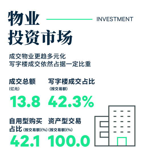 不同于以往季度的是,商業(yè)為本季的成交主力,交易額占比為44.1%,共錄得六宗交易,均位于佳兆業(yè)城市廣場(chǎng),交易總額共計(jì)人民幣6.1億元。寫字樓成交位列第二,共錄得3宗成交總額為人民幣4.6億元,交易額占比為42.3%,主要來(lái)自新建或在建的散售型項(xiàng)目的購(gòu)買,購(gòu)買目的均為自用。此外還錄得了一宗位于寶安區(qū)的工業(yè)廠房的交易。從成交方式來(lái)看,本季的所有成交均以資產(chǎn)交易的方式達(dá)成。
