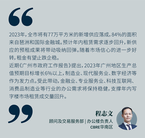 2023年,廣州預(yù)計(jì)將有32萬(wàn)平方米的優(yōu)質(zhì)零售物業(yè)投入市場(chǎng),包括珠江新城和北京路的小體量新項(xiàng)目,以及大悅城在廣州的首個(gè)項(xiàng)目。供應(yīng)量將較2022年減少4%,在需求回暖的預(yù)期下,空置率有望小幅下調(diào),整體租金將觸底,核心商圈優(yōu)質(zhì)物業(yè)有望獲得租金反彈。