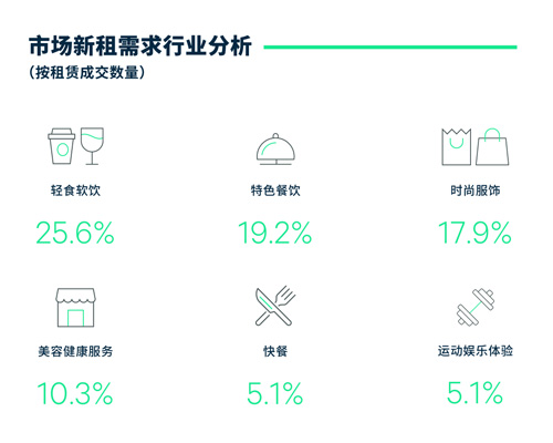 租戶(hù)成交方面,餐飲新租戶(hù)占據(jù)半壁江山,零售業(yè)態(tài)僅占比三成,而新能源汽車(chē)的拓展則有所放緩。在重點(diǎn)關(guān)注項(xiàng)目的新租品牌中,輕食軟飲、特色餐飲、時(shí)尚服飾零售、美容健康服務(wù)、快餐和運(yùn)動(dòng)娛樂(lè)體驗(yàn)業(yè)態(tài)位列前六位,占全部錄得成交的83.3%。具體而言,餐飲方面,廣州本地餐飲品牌store by jpg.,PAIX及九毛九旗下慫火鍋繼續(xù)錄得積極擴(kuò)張;而外地來(lái)的餐飲品牌費(fèi)大廚、海森堡和Blueglass Yogurt則把首店開(kāi)在了天河路及越秀區(qū)。零售業(yè)態(tài)方面,本季錄得巴黎香氛品牌DIPTYQUE廣州首店在天河路圍板。新能源汽車(chē)本季僅錄得五宗成交,較2022年第四季度有所放緩。就區(qū)域而言,天河路商圈零售業(yè)態(tài)新租占比達(dá)到40.7%,較全市總體水平高10個(gè)百分點(diǎn)。