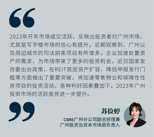 另外,倉(cāng)儲(chǔ)物流設(shè)施持續(xù)受到關(guān)注,但近期廣州及周邊城市的需求有所放緩,能提供可預(yù)計(jì)、穩(wěn)定現(xiàn)金流的項(xiàng)目更受投資者的青睞。同時(shí),被列入公募REITs領(lǐng)域的商務(wù)園區(qū)物業(yè)繼續(xù)成為熱門(mén)的投資資產(chǎn)類(lèi)別,投資者尤其看重優(yōu)質(zhì)項(xiàng)目集中的天河智慧城和科學(xué)城等區(qū)域。