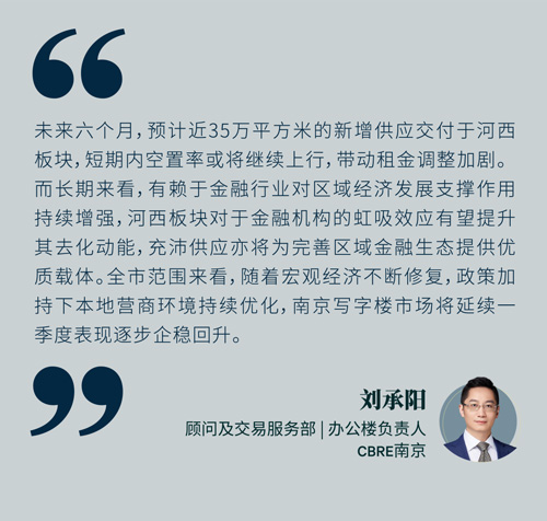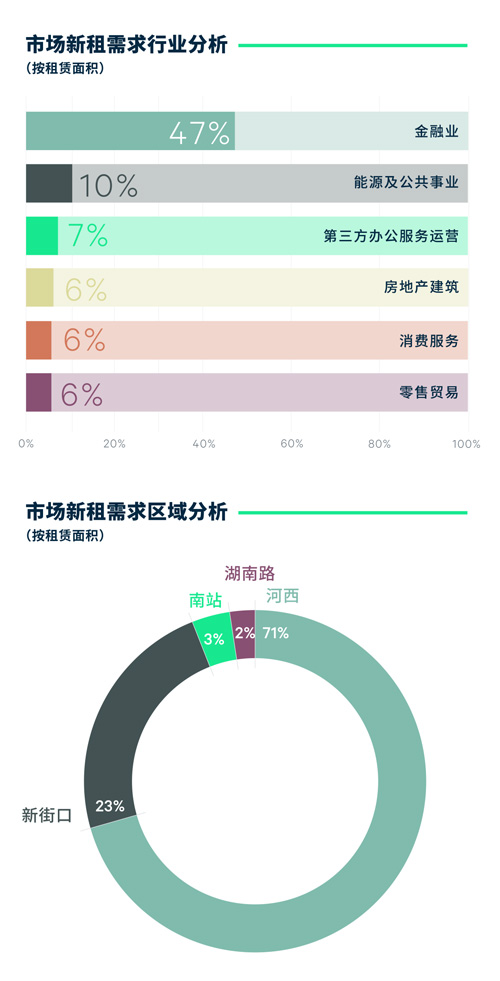 需求方面,金融業(yè)憑借占比近半的租賃需求穩(wěn)居首位。季內(nèi)河西板塊金融行業(yè)集聚優(yōu)勢(shì)突出,銀行、保險(xiǎn)與證券等傳統(tǒng)金融機(jī)構(gòu)均有大面積搬遷需求落位,推動(dòng)板塊內(nèi)部金融生態(tài)不斷完善;與此同時(shí),諸如汽車金融、普惠金融等新興金融業(yè)態(tài)于各個(gè)板塊內(nèi)標(biāo)桿項(xiàng)目錄得成交,為南京實(shí)現(xiàn)“一核兩翼、多點(diǎn)聯(lián)動(dòng)”的金融中心建設(shè)打下堅(jiān)實(shí)基礎(chǔ)。另外,能源轉(zhuǎn)型的進(jìn)程提速,驅(qū)動(dòng)以新能源產(chǎn)業(yè)為引領(lǐng)的能源及公共事業(yè)的租賃需求位居第二,升級(jí)搬遷與擴(kuò)租需求于多個(gè)板塊持續(xù)放量。后疫情時(shí)代,本土商業(yè)空間運(yùn)營(yíng)品牌依托逐漸提高的靈活辦公接納程度迎來發(fā)展新機(jī)遇,聚焦新街口核心區(qū)位積極布局。房地產(chǎn)建筑中各細(xì)分行業(yè)租賃需求釋放積極信號(hào),醫(yī)美、培訓(xùn)等多業(yè)態(tài)消費(fèi)服務(wù)韌性發(fā)展,均于新街口及河西有升級(jí)擴(kuò)張之勢(shì)。