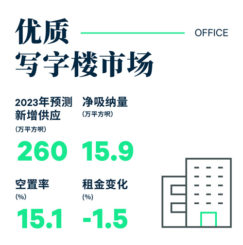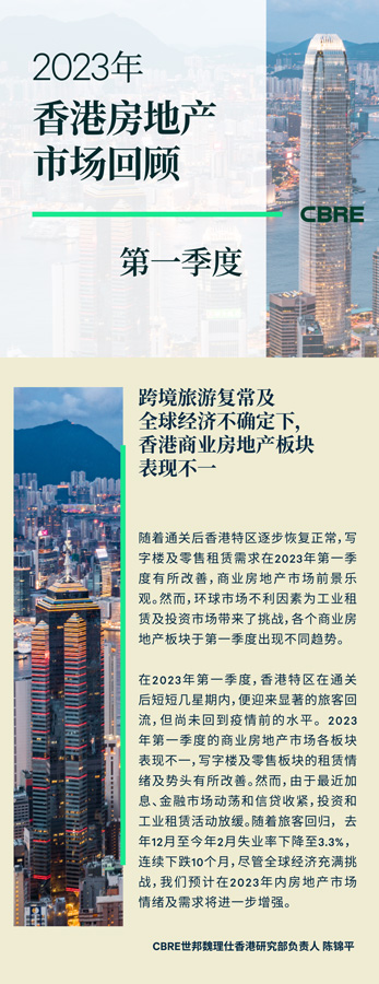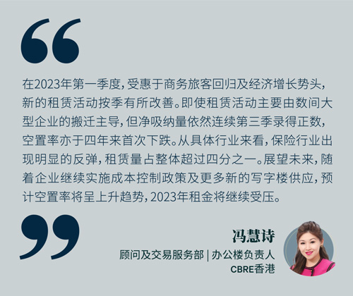 鑒于2023年第一季度未有新寫字樓供應(yīng),加上凈吸納量為正數(shù),空置率自2018年第四季度以來(lái)首次下跌0.2個(gè)百分點(diǎn)至15.1%,總空置面積為1,290萬(wàn)平方尺。