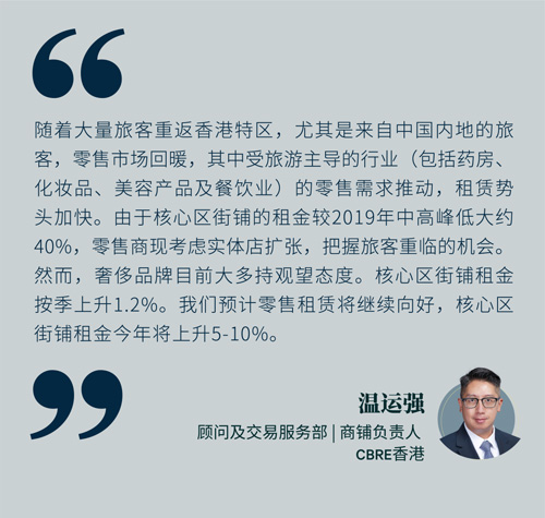 在藥店及化妝品零售商的需求推動(dòng)下,本季度租賃勢(shì)頭加快,抵消了口罩店退租一線街鋪的影響?罩寐氏陆0.5個(gè)百分點(diǎn)至14.9%,其中銅鑼灣空置率跌幅最大。盡管游客逐漸回歸,但奢侈品牌并不特別活躍。