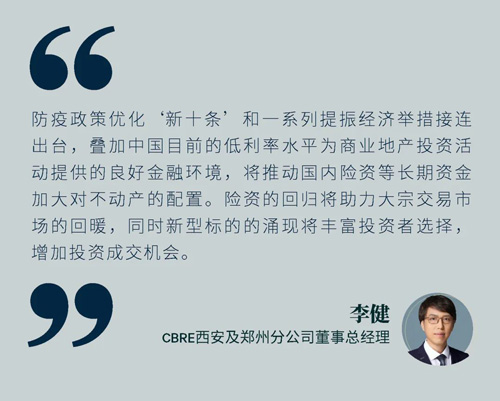 2023年第一季度西安大宗交易市場(chǎng)錄得一筆大宗成交,市場(chǎng)標(biāo)的愈加多元。目前,雖具備穩(wěn)定的投資回報(bào)及良好升值空間的寫(xiě)字樓仍是最受歡迎的投資標(biāo)的,但隨著西安文旅市場(chǎng)的全面復(fù)蘇,酒店等新興地產(chǎn)獲得更多關(guān)注。同時(shí),隨著近年來(lái)西安保障性租賃住房建設(shè)進(jìn)程的加速,政策性住房專營(yíng)企業(yè)在市場(chǎng)上愈加活躍。公寓、租賃住宅等另類資產(chǎn)獲得更多投資機(jī)會(huì)。隨著資本持續(xù)聚焦新經(jīng)濟(jì)地產(chǎn),標(biāo)的的多元發(fā)展將推動(dòng)西安大宗物業(yè)交易市場(chǎng)活躍度快速提升。