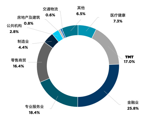 從行業(yè)上劃分,金融業(yè)占比最大,專業(yè)服務(wù)業(yè)和TMT緊隨其后,分別為25.8%、18.4%和17.0%,這三類總占比超六成。