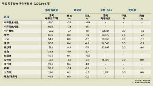 受壓于空置率飆升,港島區(qū)整體甲級寫字樓租金于5月份進一步下跌。2023年的前五個月,港島區(qū)整體甲級寫字樓租金下跌2.5%。其中,中環(huán)寫字樓租金的跌幅最高,達到4.1%。