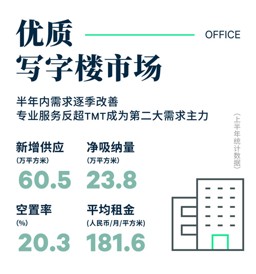 租金仍然處于下行通道,經(jīng)濟增長弱于預期,部分租戶對新租持謹慎及觀望態(tài)度。有鑒于此,疊加部分項目樓內(nèi)租戶到期的搬出計劃,業(yè)主主動降價以留存原有租戶和吸引新租戶,從而最大限度地規(guī)避風險以應(yīng)對未來的不確定性。此外新增供應(yīng)的增加對于項目競爭的加劇,更強化了業(yè)主的降價行為,從而令全市平均租金上半年環(huán)比下跌0.9%至每月每平方米181.6元。