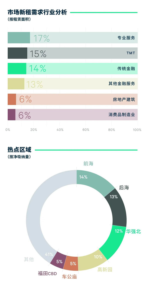 行業(yè)監(jiān)管以及地緣政治等多重因素影響下,深圳優(yōu)質(zhì)寫字樓市場需求清單重排,專業(yè)服務(wù)反超TMT成為第二大需求主力。金融以27.1%的需求占比位居需求榜首,同比上升1.8個百分點,其中傳統(tǒng)金融細分需求主要來自證券、銀行和保險三大細分板塊。證券公司的需求主要來自大型內(nèi)資券商的搬遷需求帶動,而銀行方面內(nèi)外資銀行新租賃均較為活躍。此外,投資理財和金融科技類企業(yè)新租也較為積極。專業(yè)服務(wù)板塊需求占比為17.2%,新租面積及租賃占比同比均有明顯提升,法律和咨詢?yōu)閮纱笮枨笾е,貢獻了該板塊8成以上的需求,占比分別為45.0%和38.3%。法律板塊方面,融資、IPO、退市重整、企業(yè)間的兼并收購等活動帶動了律所業(yè)務(wù)的增長以及引致而來的辦公需求擴張,除本地企業(yè)外,還包括來自于北京、上海的企業(yè);而咨詢行業(yè)的需求主要源自企業(yè)管理、信息技術(shù)咨詢和稅務(wù)咨詢類企業(yè)。TMT受多重因素影響上半年需求滑落至第三位,需求占比15.0%,需求表現(xiàn)較為活躍的細分需求為電信通訊、平臺互聯(lián)網(wǎng)下的社交網(wǎng)絡(luò)服務(wù)、跨境電商、互聯(lián)網(wǎng)信息服務(wù)(大數(shù)據(jù))、電商、云計算及運用以及人工智能等。