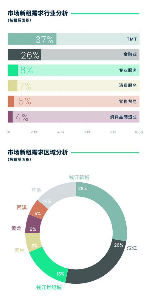 行業(yè)需求方面,TMT以37%的占比位列需求首位,其細(xì)分產(chǎn)業(yè)向電商類傾斜,上半年近半數(shù)TMT相關(guān)需求來自于直播電商類企業(yè)的租賃活動。其中,頭部直播租戶的活躍需求帶動包括濱江和錢江世紀(jì)城等非核心板塊去化。其次,以銀行、保險為代表的金融業(yè)租戶需求穩(wěn)固,占比26%,主要聚焦錢江新城板塊內(nèi)高品質(zhì)甲級寫字樓,品質(zhì)升級需求趨勢顯著。此外,專業(yè)服務(wù)類需求占比8%,以會計、法律以及咨詢等細(xì)分行業(yè)活躍度較高,主要布局核心區(qū)位。