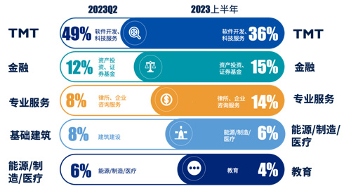 2023年上半年的搬遷交易僅為去年同期的27%,第二季度的搬遷行為只有第一季度的60.7%,企業(yè)變得更加謹(jǐn)慎務(wù)實(shí)和觀望態(tài)度,整體市場(chǎng)呈現(xiàn)疲軟狀態(tài),上半年總體甲級(jí)辦公樓市場(chǎng)凈吸納為負(fù)100,795平方米,在上半年新供應(yīng)稀缺的情況下,空置率繼續(xù)攀升至16.5%,二季度部分業(yè)主開始積極調(diào)整租金策略,甲級(jí)整體市場(chǎng)凈有效租金較第一季度下降至322.3元/月/平方米,租賃交易面積比例排行依次為:TMT依舊占有重要比重、金融與專業(yè)服務(wù)列在第二和第三位,基礎(chǔ)建設(shè)占據(jù)了第四位。