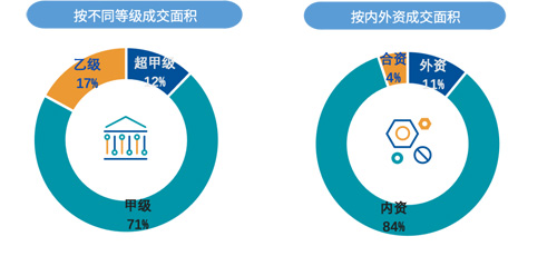 按行業(yè)劃分的租賃活動(dòng)中,以TMT行業(yè)為首,占49%;金融業(yè)占據(jù)了12%的第二大份額,但連續(xù)兩季度活躍度降低;專業(yè)服務(wù)以8%的占比排列第三。相較于上季度,CBD商圈成交降低幅度最大,成交面積錄得10%。本季度超甲級(jí)寫字樓的成交交易達(dá)到12%,說(shuō)明部分企業(yè)把握機(jī)遇提升樓宇品質(zhì)。內(nèi)資企業(yè)的成交面積依然遠(yuǎn)遠(yuǎn)大于外資企業(yè)的成交面積。