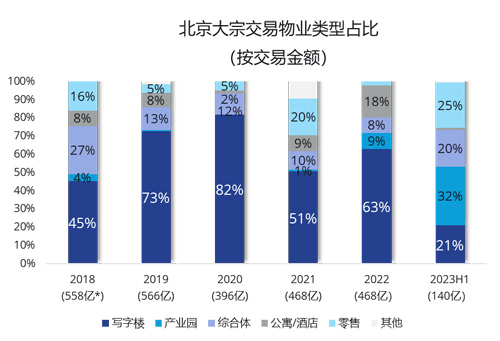 據(jù)統(tǒng)計(jì),2018年至2022年的主導(dǎo)交易物業(yè)類型為寫字樓,但2023年上半年,寫字樓交易金額占比有下降的跡象。
