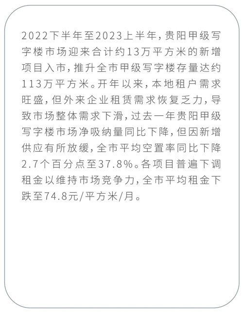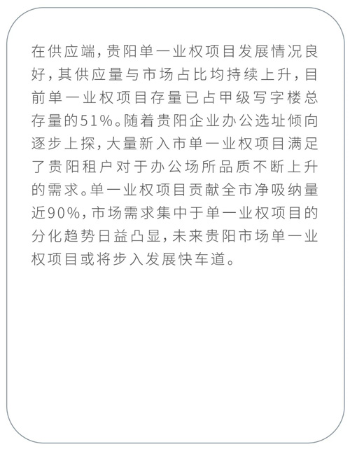 甲級寫字樓市場雖受近一年內(nèi)經(jīng)濟環(huán)境影響,外來租賃需求增長乏力,但優(yōu)質(zhì)項目的不斷入市激發(fā)了本地租戶升級搬遷需求,未來單一業(yè)權(quán)優(yōu)質(zhì)項目或?qū)⒊掷m(xù)保持目前良好的發(fā)展態(tài)勢。貴陽零售消費市場整體運行平穩(wěn),新項目入市有利于提升貴陽商業(yè)項目整體品質(zhì)。