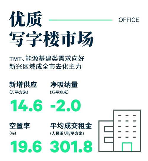 2023年第二季度,位于通州區(qū)域的三個新項目交付使用,新增寫字樓租賃面積14.6萬平方米,上半年新增供應共完成全年總量的1/5。新項目未有租戶入駐,全市空置率因而環(huán)比上漲0.5個百分點至19.6%。