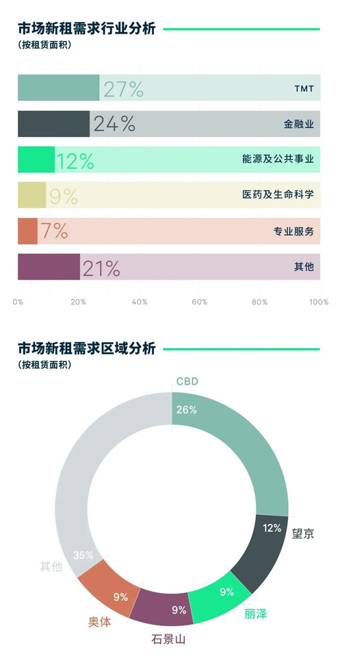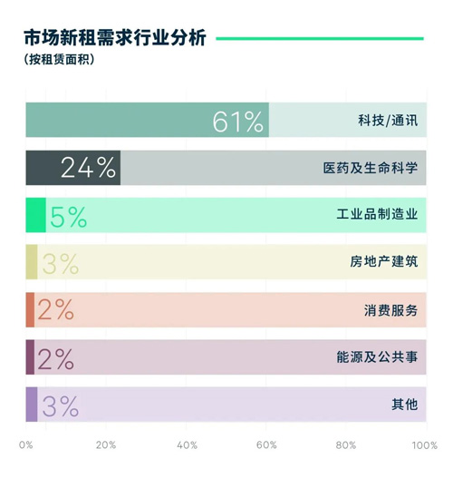 本季度全市凈吸納量錄得2.2萬平方米,其中既有項目凈吸納量由負轉正,但上半年凈吸納量仍不及去年同期;ヂ(lián)網(wǎng)頭部企業(yè)大面積騰退現(xiàn)象明顯緩和,TMT新租需求超過醫(yī)藥及生命科學成為季內(nèi)市場主力,錄得占比超70%,其中圍繞互聯(lián)網(wǎng)教育或云計算相關的科技企業(yè)開始釋放擴租或升級搬遷需求。醫(yī)藥及生命科學以及航空航天,裝備制造等工業(yè)品制造類亦有表現(xiàn)。