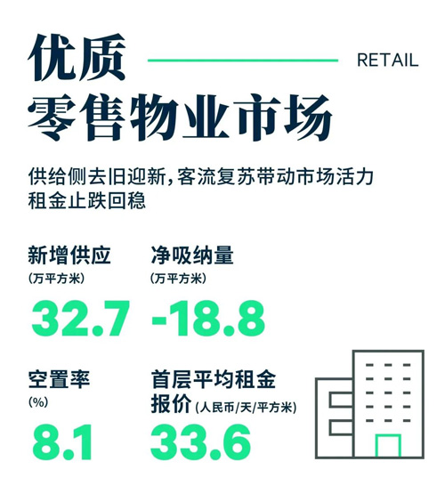 季內(nèi)品牌選址活躍度有明顯提升,但實際轉化落地依舊謹慎。隨著消費結構的變化,品牌表現(xiàn)和租賃需求呈兩級分化,低端及高端品牌恢復情況優(yōu)于中端品牌。本季購物中心首層平均租金止跌回穩(wěn),同樣本比環(huán)比上漲0.2%至每天每平方米33.6元,核心商圈中CBD率先回升。