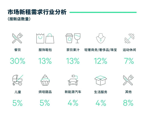 季內(nèi)租賃需求穩(wěn)中有升,客流持續(xù)復蘇,尤其是節(jié)假日期間王府井、五棵松、中關村等熱門商圈客流量同比增長2-4倍。首店經(jīng)濟持續(xù)發(fā)力,新增項目、核心商圈及社區(qū)屬性較強的購物中心皆有眾多餐飲及零售的北京或區(qū)域首店落位。餐飲需求回暖較快,占據(jù)總新增店鋪數(shù)量的40%(如侘與火、隱泉之語、東粵洋樓)。零售業(yè)態(tài)本季亦表現(xiàn)良好,其中由服飾鞋包(如Badmarket、Blanc&Eclare、JNBY)、輕奢商務(如Sergio Rossi、45R、Atsuro Tayama)及運動休閑(如Kailas、始祖鳥、Satisfy、Pas Normal Studios)領跑,合計占據(jù)總新增店鋪數(shù)量的27%。M Stand、茶話弄、霸王茶姬等茶飲果汁類網(wǎng)紅品牌拓店節(jié)奏依舊穩(wěn)健,落位在合生匯、龍湖大興天街、朝陽大悅城等優(yōu)質購物中心。兒童體驗類業(yè)態(tài)及新能源汽車本季熱度減弱?v觀上半年,餐飲、服飾鞋包及茶飲果汁位列需求引擎前三名。