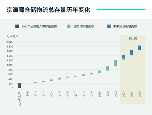 自2020年以來,京津廊高標倉存量進入加速增長期,2022年新增供應(yīng)量達260萬平方米,對應(yīng)當(dāng)年存量擴容增速高達28%;2023-2025年年均新增供應(yīng)預(yù)計保持在210萬平方米。2023年第二季度,北京、天津、廊坊三地空置率分別達到15.0%、30.2%和50.2%。龐大的新增體量引發(fā)市場擔(dān)憂:京津廊市場整體是否將長期陷入供需失衡和租金下行?