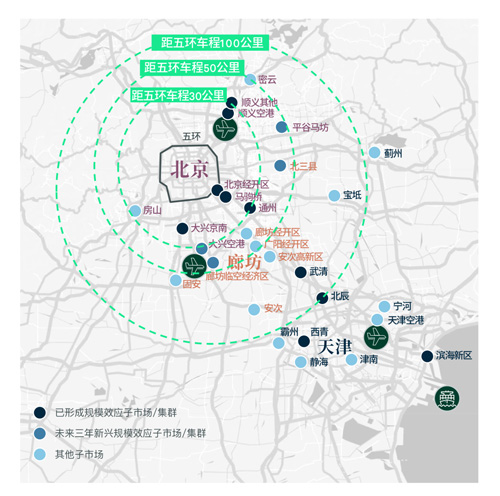 和北京主城區(qū)(五環(huán))的車程距離,是識別子市場需求勢能的重要標準,可分為三個圈層: