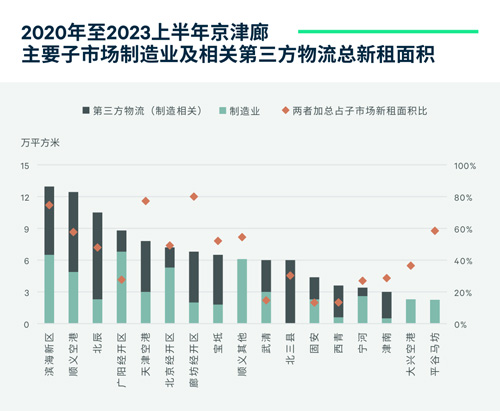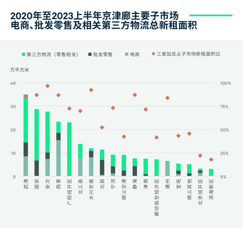 電商和批發(fā)零售倉儲都具有需求面積較大、周轉(zhuǎn)率和時效要求高等特點,需綜合考量與重點消費市場距離、交通便捷度、物業(yè)品質(zhì)和可選度、租金水平等條件,位于北京外圍及環(huán)京子市場因性價比優(yōu)勢而成為首選。此外,天津本地消費市場也對其近郊子市場需求形成支撐。
