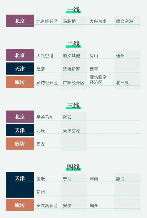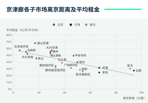第三圈層:距50-100公里,涵蓋廊坊和天津部分子市場,平均租金在24-32元/平方米/月之間。