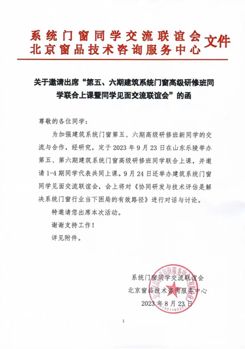 關(guān)于邀請出席“第五、六期建筑系統(tǒng)門窗高級研修班同學(xué)聯(lián)合上課暨同學(xué)見面交流聯(lián)誼會(huì)”的函