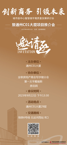 9月22日,"城市副中心寫字樓發(fā)展機遇與挑戰(zhàn)"研討會將在通州C01大廈盛情舉辦,邀約政府及商協(xié)會領(lǐng)導(dǎo)、業(yè)內(nèi)專家以及渠道代理精英相聚于此,解讀探秘區(qū)域高品質(zhì)樓宇的魅力,共同探索運河商務(wù)區(qū)高質(zhì)量發(fā)展路徑。