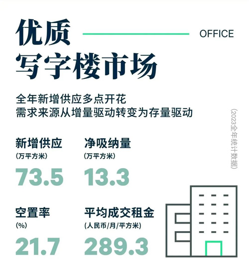 2023年第四季度,位于麗澤和石景山區(qū)域的兩個新項目交付,新增寫字樓面積共計12.8萬平方米。全年以73.5萬平方米的總量,在近15年內(nèi)排名年新增供應量第三。全年新增項目分布于多個子市場,且甲級項目占總體量的70%以上,為升級需求提供了充足的落位空間,特別是傳統(tǒng)區(qū)域的甲級新項目憑借區(qū)位、樓宇品質(zhì)及租金性價比高等優(yōu)勢,去化面積占比在新項目去化總量中高達85%。