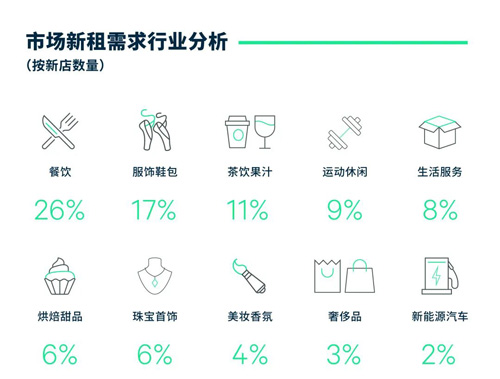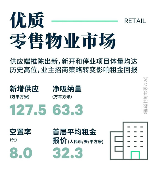 部分存量標(biāo)桿項(xiàng)目,如國(guó)貿(mào)商城、北京APM、朝陽(yáng)合生匯、朝陽(yáng)大悅城等,加速品牌結(jié)構(gòu)調(diào)整節(jié)奏,成功引入高奢、高化香氛、潮流服飾及大眾餐飲等諸多業(yè)態(tài)。季內(nèi)零售業(yè)態(tài)開(kāi)店占比達(dá)52%,以運(yùn)動(dòng)戶外(如Salomon、Saucony)、潮流服飾(如Acne Studios、鄂爾多斯)、美妝香氛(如聞獻(xiàn)、3CE)為主,而餐飲業(yè)態(tài)則以39%的穩(wěn)定增速緊隨其后(如霸王茶姬、TheWoodsCafe、One Bagel等)?v觀全年拓店表現(xiàn),零售與餐飲不分伯仲,分別占據(jù)新開(kāi)店數(shù)量的46%及43%。零售業(yè)態(tài)中服飾鞋包穩(wěn)坐首席,運(yùn)動(dòng)休閑持續(xù)擴(kuò)張,珠寶首飾等貴重金屬緊隨其后;餐飲及茶飲果汁亦有不同程度的提升,其中地域性較強(qiáng)的大眾餐飲、網(wǎng)紅茶飲、大眾烘焙甜品等在不同商圈多點(diǎn)開(kāi)花;其他業(yè)態(tài)中,新能源汽車拓店步伐放緩。線下消費(fèi)回流加速,尤其節(jié)假日客流復(fù)蘇明顯,加上大量新商場(chǎng)集中開(kāi)業(yè)帶動(dòng),全市凈吸納量同比提升110%達(dá)63.3萬(wàn)平方米。全年空置率在年初沖高后逐步回落,季內(nèi)環(huán)比下降0.3個(gè)百分點(diǎn)至8.0%。
