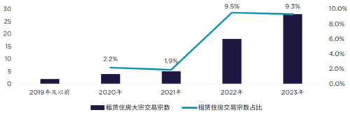 近年來租賃住房大宗交易宗數(shù)及宗數(shù)占比
