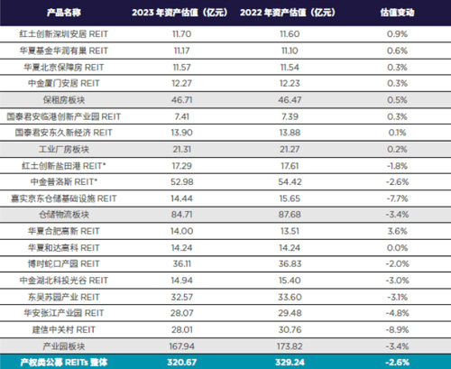 根據(jù)滬深交易所信息披露顯示,2023年已發(fā)行產(chǎn)權(quán)類項(xiàng)目資產(chǎn)估值較2022年整體下降2.6%,這一變化背后,反映了宏觀經(jīng)濟(jì)環(huán)境、行業(yè)政策及市場需求等多方面因素的綜合影響。作為最早發(fā)行的資產(chǎn)類別,倉儲物流及產(chǎn)業(yè)園板塊受到上下游產(chǎn)業(yè)變動、區(qū)域市場供需關(guān)系變化、現(xiàn)金流主要提供方退換租等多重因素影響整體資產(chǎn)估值下降約3.4%。