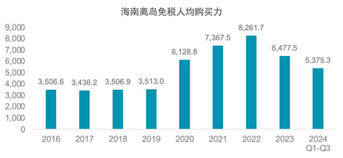 過去四年對房地產市場的深度調整對中產收入群體帶來了巨大打擊,資產貶值導致的家庭財富縮水也是目前消費復蘇遲緩的重要原因。以海南離島免稅人均購買力為例,2024年前三季度海南離島免稅人均購買力從2022年8261元/人的頂點下降至5375元/人,降幅高達35%。