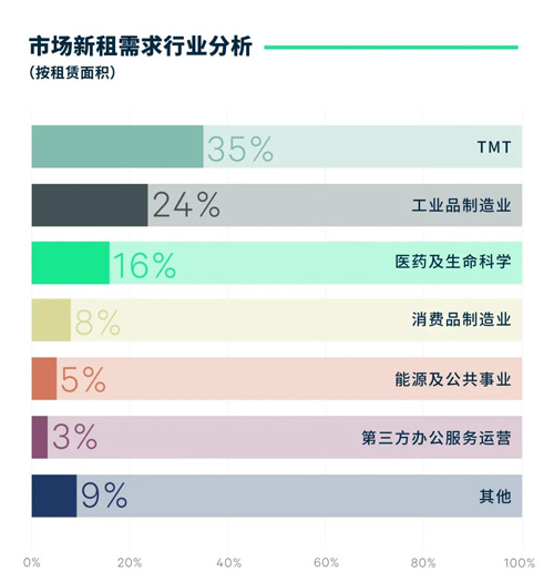 行業(yè)需求方面,TMT行業(yè)以35%占比保持租賃需求首位,其中軟件系統(tǒng)開發(fā)子分類表現(xiàn)亮眼,特別是人工智能、大數(shù)據(jù)及自動駕駛相關賽道企業(yè),充分體現(xiàn)當前新舊動能轉換下的產(chǎn)業(yè)升級帶來的新興行業(yè)租賃需求釋放。同時在線經(jīng)濟的繁榮推動電商、智慧零售等相關需求釋放。主要得益于集成電路產(chǎn)業(yè)的旺盛需求,工業(yè)品制造業(yè)以24%的占比位列第二。 各環(huán)節(jié)國產(chǎn)芯片企業(yè)積極落址浦東,涵蓋從半導體設備、EAD工具,到多類型芯片設計,封裝測試等企業(yè)。形成以全產(chǎn)業(yè)鏈為導向的國產(chǎn)化成長和集群效應。另錄得自動化裝備、機器人、航空航天類先進制造業(yè)企業(yè)成交。醫(yī)藥及生命科學以16%占比位列需求第三,特色生物醫(yī)藥園區(qū)項目積極吸引創(chuàng)新藥企業(yè)入駐,而大健康產(chǎn)業(yè)的發(fā)展也推動醫(yī)藥服務類租戶的大面積成交。