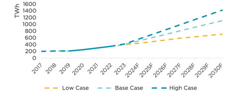 2017-2030數(shù)據(jù)中心需求對(duì)應(yīng)的預(yù)測(cè)電力消耗量(單位:TWh)