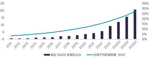 全球平均機(jī)架密度及預(yù)測(cè)(單位:KW)