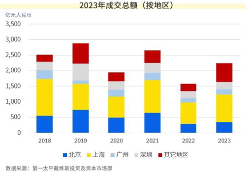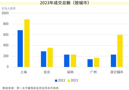 2023年全年一線城市成交額約1,640億,占全國(guó)成交總額約73%。其中深圳較2022年全年成交總額持平,京滬穗三個(gè)城市成交總額較2022年則皆錄得增長(zhǎng),一線城市整體同比漲幅約21%。其中,綜合體及商業(yè)資產(chǎn)的成交同比大幅上升。