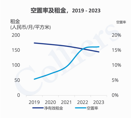 截至2023年第四季度,廣州甲級寫字樓空置率為16.2%。得益于今年新入市項目的自用面積去化以及個別項目延期入市,今年全市空置率上升低于1.0個百分點,空置率增長速度低于預期。在子市場中,越秀市場“以價換量”成效相對顯著,空置率在今年下降約5.0個百分點,錄得子市場中最大降幅。