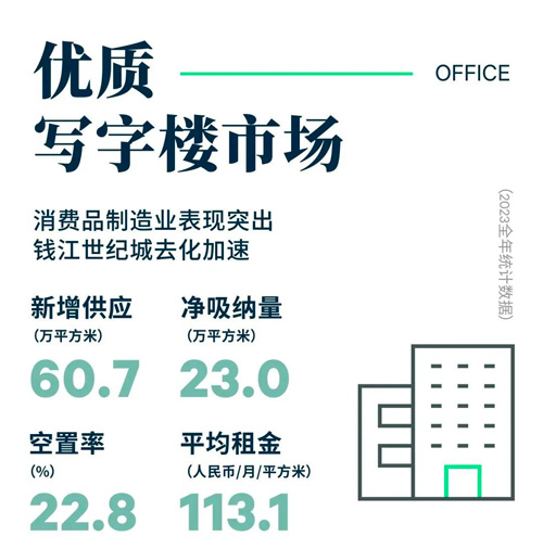 行業(yè)需求方面,2023年全年,以銀行、保險(xiǎn)和證券為代表的金融類租戶持續(xù)整合升級(jí)搬遷,布點(diǎn)以錢江新城為代表的主要板塊,占比31%,年內(nèi)需求以升級(jí)整合為主導(dǎo)。此外,消費(fèi)品制造業(yè)受某新能源汽車企業(yè)大面積落地影響,需求占比躍升,以22%的占比位居需求次席,除新能源汽車類租戶外,年內(nèi)亦有包括服飾珠寶、食品以及快消品等消費(fèi)品品類租戶落址。TMT類租戶需求穩(wěn)健,占比18%,主要以直播電商需求活躍于直播相關(guān)熱點(diǎn)板塊。值得一提的是,消費(fèi)服務(wù)類年內(nèi)需求活躍,醫(yī)美和教育留學(xué)相關(guān)品類租戶需求顯著。