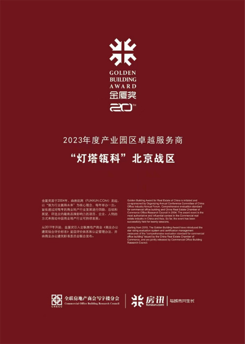 2023年12月28日-29日,中國(guó)寫(xiě)字樓產(chǎn)業(yè)園發(fā)展論壇第二十屆年會(huì)在北京富力萬(wàn)麗酒店舉辦。年會(huì)由北京市投資促進(jìn)服務(wù)中心、北京商務(wù)中心區(qū)管理委員會(huì)、全聯(lián)房地產(chǎn)商會(huì)指導(dǎo),全聯(lián)房地產(chǎn)商會(huì)寫(xiě)字樓分會(huì)、首都會(huì)展(集團(tuán))有限公司、房訊網(wǎng)FUNXUN聯(lián)合主辦。尤為值得關(guān)注的是,2023第20屆“GOLDEN BUILDING AWARD金廈獎(jiǎng)”評(píng)選結(jié)果在年會(huì)上正式揭曉,并舉行了盛大的頒獎(jiǎng)典禮,表彰市場(chǎng)上涌現(xiàn)出來(lái)的優(yōu)秀企業(yè)、項(xiàng)目,對(duì)商業(yè)地產(chǎn)、產(chǎn)業(yè)園區(qū)的發(fā)展產(chǎn)生引領(lǐng)和示范效果。燈塔瓴科北京戰(zhàn)區(qū)斬獲“2023年度產(chǎn)業(yè)園區(qū)卓越服務(wù)商”,閃耀產(chǎn)業(yè)界內(nèi)外。燈塔瓴科北京戰(zhàn)區(qū)憑借自身在產(chǎn)業(yè)創(chuàng)新方面的銳意進(jìn)取,再次得到了業(yè)界的肯定和嘉獎(jiǎng)。