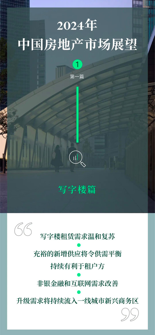 我們將分四篇發(fā)布《2024年中國(guó)房地產(chǎn)市場(chǎng)展望》報(bào)告的主要發(fā)現(xiàn),逐篇分析寫(xiě)字樓、倉(cāng)儲(chǔ)物流、零售物業(yè)、物業(yè)投資等板塊的發(fā)展趨勢(shì)和機(jī)遇。