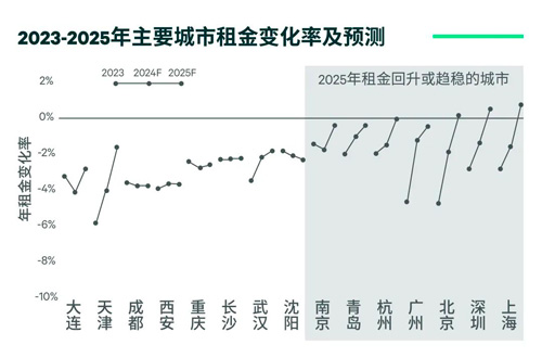 與此相反,空置率較高或需求補(bǔ)給疲軟的華北及中西部二線城市2024年租金跌幅仍然較大,止跌企穩(wěn)還需要更長(zhǎng)的周期。