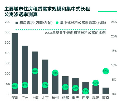 CBRE的測算顯示,國內(nèi)主要城市的機構化長租公寓滲透率均低于10%。與此形成對比的是,58同城和安居客發(fā)布的《2023年畢業(yè)生租住報告》顯示,傾向于租賃長租公寓的畢業(yè)生占比達到22%,這一年輕群體無疑更能體現(xiàn)住房租賃消費的未來演變方向。