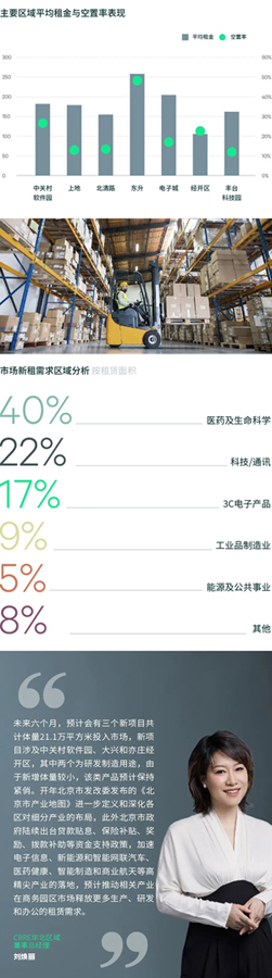 租金繼續(xù)在下降渠道,季內全市租金報價錄得環(huán)比下降0.8%至每月每平方米155.8元,尤其以泛中關村集群租金下調領先。另外,熱門板塊生命科學專項園區(qū)季內租金報價同樣本比維持平穩(wěn)錄得每月每平方米109.2元。