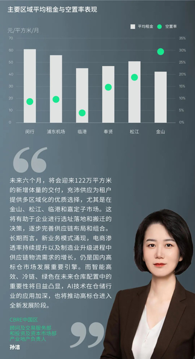 租金方面,閔行、浦東機(jī)場和臨港等子市場租金報(bào)價(jià)保持穩(wěn)定,而連續(xù)季度的供應(yīng)放量導(dǎo)致南部部分區(qū)域金山,奉賢和青浦的租金略有松動(dòng),整體租金環(huán)比下行0.9%至每月每平方米48.8元。