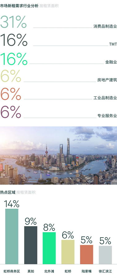 區(qū)位表現(xiàn)上,虹橋商務(wù)區(qū)受到汽車企業(yè)搬遷需求影響,較上季度提升明顯;北外灘去化表現(xiàn)穩(wěn)定,第三方辦公繼續(xù)布局;真如租賃需求穩(wěn)中有升,主要來(lái)自電商及消費(fèi)品制造業(yè)企業(yè)。世紀(jì)大道、黃浦濱江及人民廣場(chǎng)的租賃需求仍然相對(duì)較為低迷。企業(yè)性質(zhì)及交易類型來(lái)看,內(nèi)資機(jī)構(gòu)仍為需求主力;新租交易的主要需求類型仍為搬遷,新設(shè)立需求持續(xù)放緩。