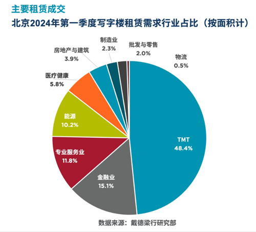 一季度,隨著北京數(shù)字經(jīng)濟的快速發(fā)展,TMT行業(yè)成交面積約占所有行業(yè)總成交面積的一半,為48.4%。其次為金融業(yè)和專業(yè)服務(wù)業(yè),分別占所有行業(yè)總成交面積的15.1%和11.8%。能源行業(yè)則延續(xù)2023年的強勁勢頭,位居第四位,占所有行業(yè)總成交面積的10.2%。
