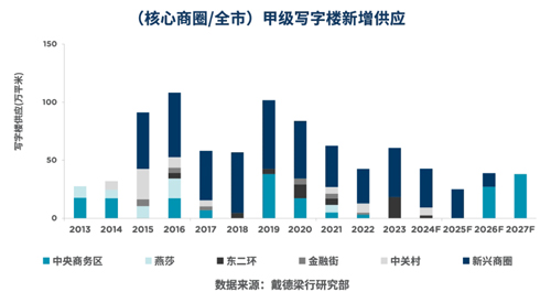 截止至2027年,北京寫字樓市場新增供應(yīng)將達144.7萬平方米,其中2024年為供應(yīng)高峰。預(yù)計二季度,新項目的入市加之市場的高空置很難在短期內(nèi)被去化,租金水平將繼續(xù)面臨下行壓力。下半年隨著經(jīng)濟和市場活躍度的逐漸恢復(fù),預(yù)計年底租金水平將趨于穩(wěn)定或迎來觸底拐點。未來幾年,隨著企業(yè)經(jīng)濟效益的好轉(zhuǎn)、新興產(chǎn)業(yè)的快速布局和相關(guān)政策的不斷推進,北京寫字樓市場租賃需求有望得到提升。