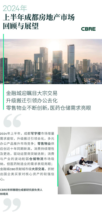 展望2024年下半年,成都優(yōu)質(zhì)寫字樓市場供應回升,約65萬平方米的樓宇預計交付,將推動總存量在年末突破千萬;其中,62.4%的供應將落于天府新區(qū),區(qū)域去化壓力將進一步加大。與此同時,順應辦公需求靈活、多樣的趨勢,第三方辦公服務商預計保持擴張態(tài)勢;存量樓宇也將繼續(xù)積極應變求進,通過改造空置房源以推出精裝、定制類產(chǎn)品。因此,下半年供應端不僅量升,亦將呈現(xiàn)更多元化的辦公產(chǎn)品,市場競爭或?qū)⒓觿 ?/P>