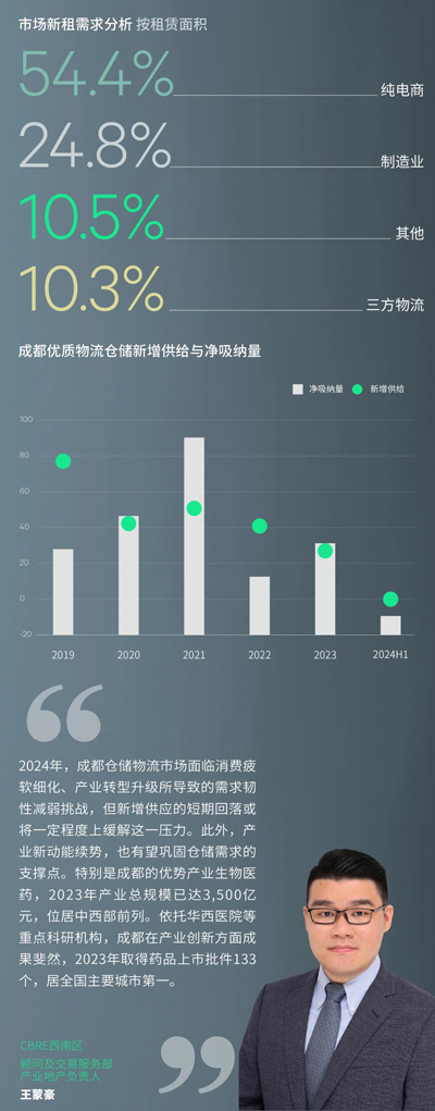 就產(chǎn)業(yè)發(fā)展而言,2024年1—5月份,成都規(guī)模以上工業(yè)增加值同比增長2.8%;分行業(yè)看,電子信息和裝備制造分別下降3.3%和1.4%,但醫(yī)藥健康產(chǎn)業(yè)增長3.3%。產(chǎn)業(yè)的轉型升級使市場機遇和挑戰(zhàn)并行,上半年制造業(yè)占比新增需求的24.8%,居第二,其中醫(yī)藥制造類需求占比高達80.5%,成新增點;但也占比退租面積的28.1%,居第三,其中55.4%的退租來自于汽車及零部件類企業(yè)。