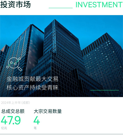 2024年上半年,成都投資市場共錄得四筆大宗交易,總成交金額達47.9億元,同比、環(huán)比均實現(xiàn)增長。標的物方面,延續(xù)多樣化趨勢,涵蓋商業(yè)、綜合體及工業(yè)廠房等物業(yè);買家構成方面,仍以國企和本地企業(yè)為主。